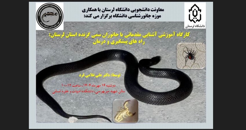 کارگاه آموزشی «آشنایی مقدماتی با جانوران سمی گزنده استان لرستان؛ راههای پیشگیری و درمان»، روز دوشنبه ۱۴ مهرماه ۱۴۰۴ در دانشگاه لرستان برگزار میشود.